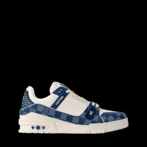 The iconic LV Trainer sneaker is revisited this season in a combination of Monogram denim and Monogram-embossed grained calf leather. The contrasting colors and materials highlight the elaborate construction of this model, which was inspired by vintage basketball sneakers.